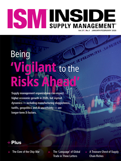 The January/February issue of Inside Supply Management® explores the evolving landscape of global supply chains, highlighting both opportunities and risks for organizations in 2026. The cover story discusses anticipated economic growth alongside such persistent challenges as manufacturing sluggishness, tariffs, geopolitical tensions and the uncertainties of AI. Feature articles examine the strategic importance of semiconductor supply chains amid a global chip power struggle, as well as practical approaches for companies to navigate tariff-driven and geopolitical volatility — including stress-testing, agility and leveraging advanced technologies. The fourth feature emphasizes the critical role of understanding Incoterms in managing complex international trade, as misunderstandings can lead to costly disruptions.